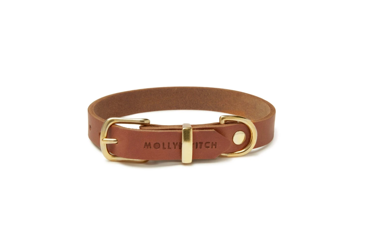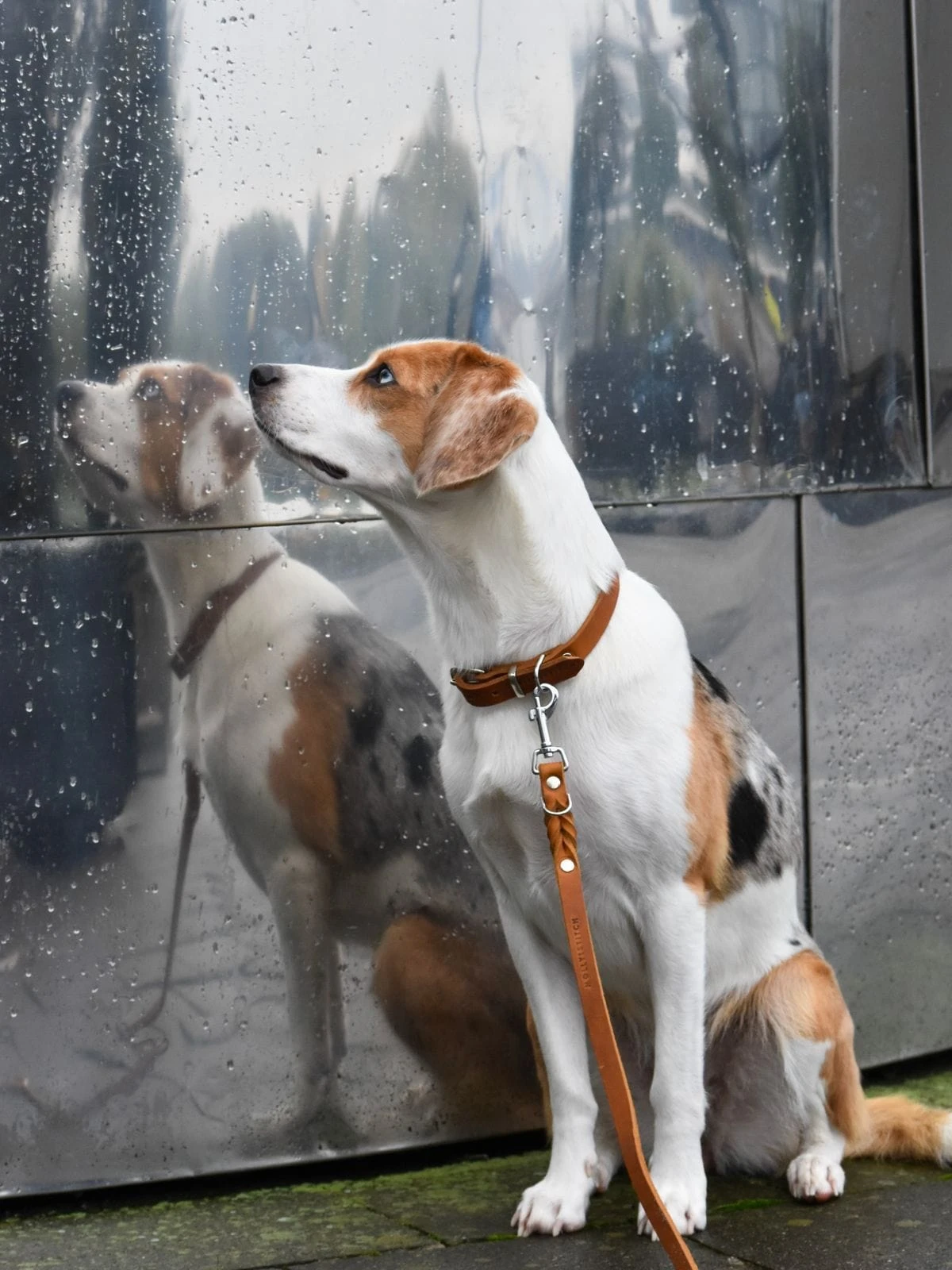 Dress your pet with comfort and confidence. Our Scandinavian-inspired dog collars are handmade in Austria with naturally tanned and softened German leather. The buttery material is super soft against their skin and reliably strong. Choose between solid brass and steel to match your style. The minimalistic buckle, rivets, and leash clip gleam in the sunlight with a luxury finish.