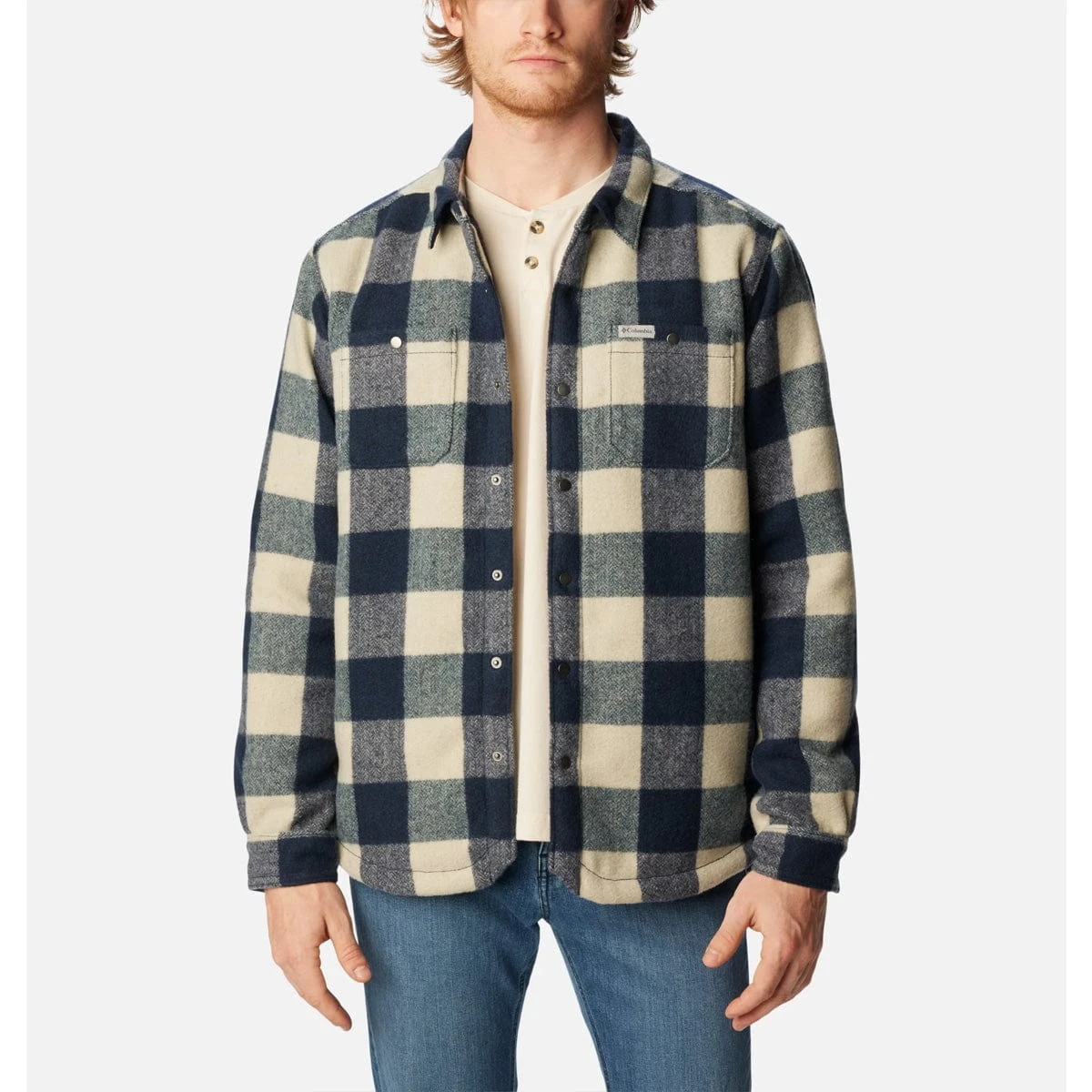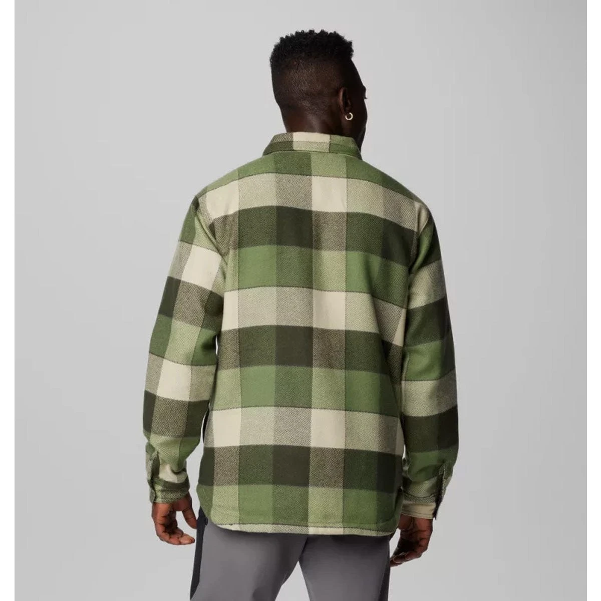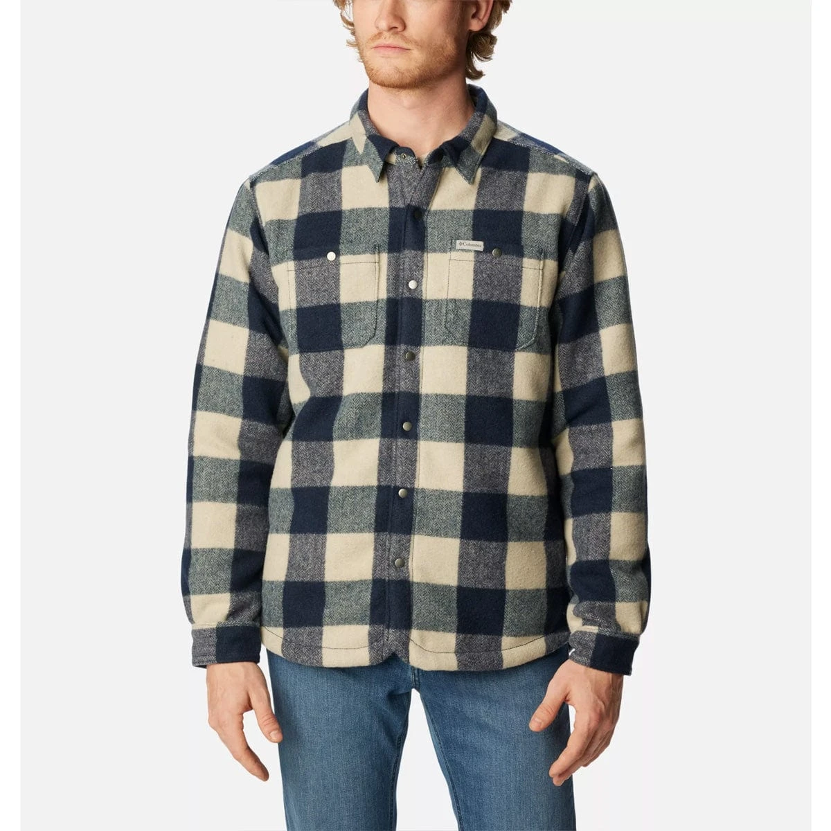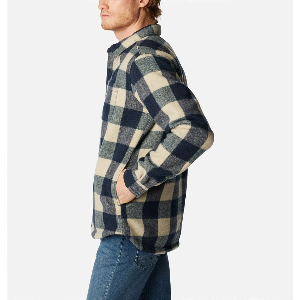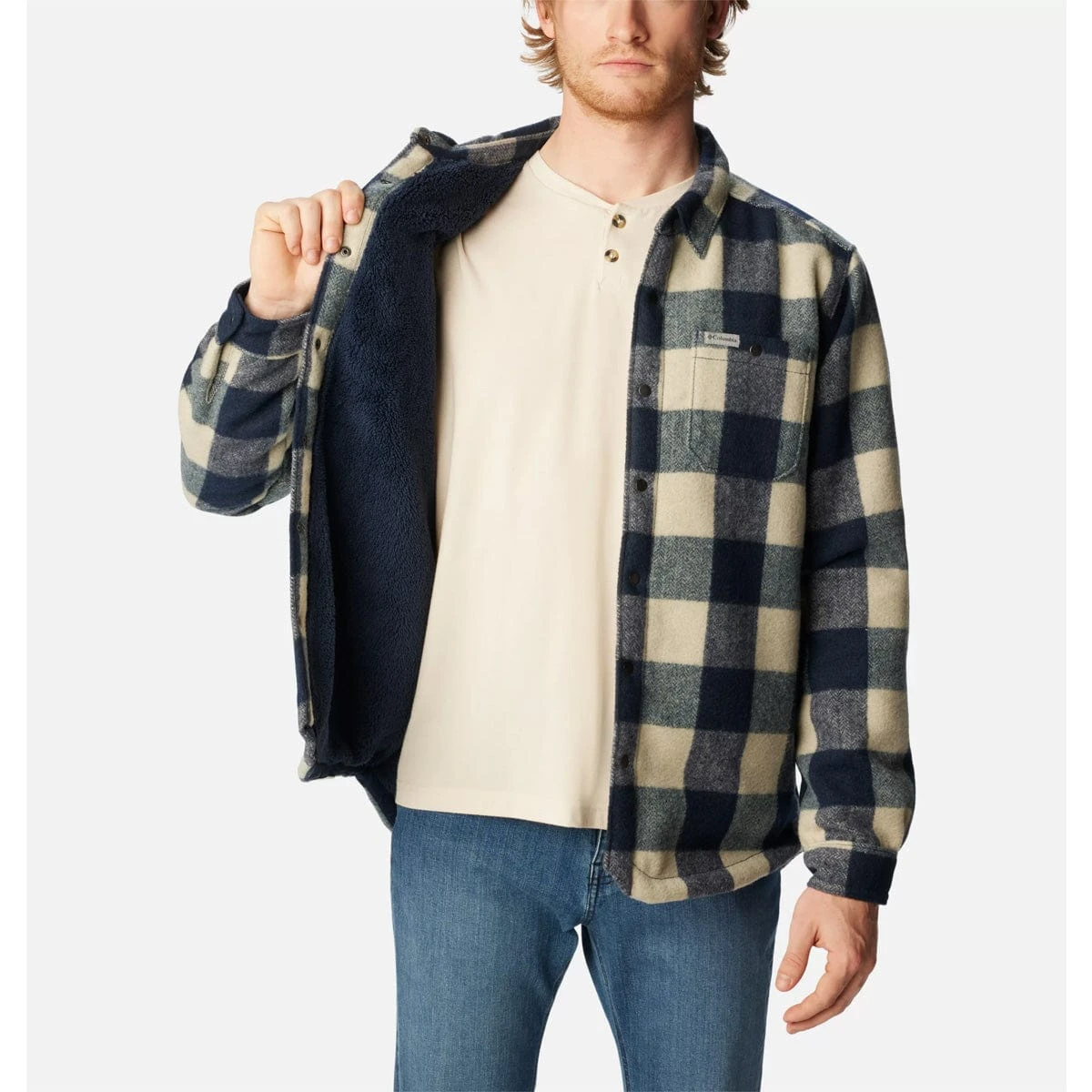 This plaid shirt jacket features warm Sherpa fleece lining making it a go-to casual layer on chilly days.