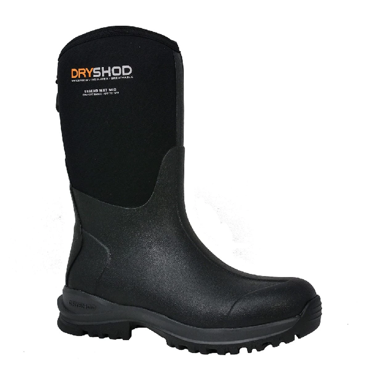 These DRYSHOD Legend MXT Mid Women’s Black Boots are lightweight, comfortable, and versatile. The Legend has a comfort Range of -10° to 75° F. These boots are 100% waterproof top to bottom and feature a 5mm Densoprene® Foam insulated bootie to keep out the cold and wet and keep in the warm & dry. Hydrokote® water repellent rolls water off and dries in seconds. The 4-way stretch breathable air mesh lining moves the air and keeps your feet dry and comfortable. The roll-down calf pipe allows you to tuck your pant leg or vent in warm temperatures. These boots are constructed of genuine hand-laid rubber; no PVC, PU or TPR. A reinforced tuck board with rigid shanks provides superior stability. These boots are slipper-soft and are sized to athletic shoe standards. Convenient back-pull tabs for easy-on/easy-off convenience.