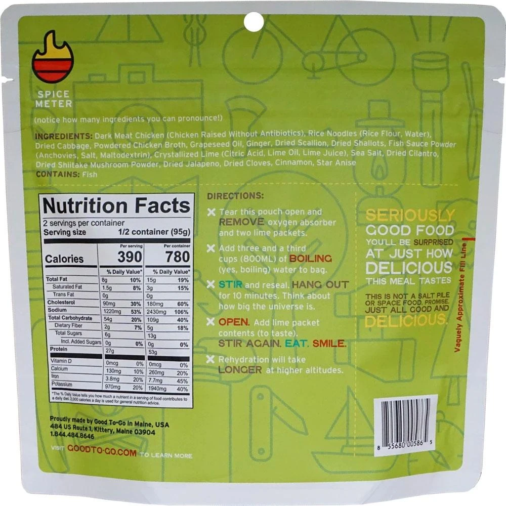 Dark Meat Chicken (Chicken Raised Without Antibiotics), Rice Noodles (Rice Flour, Water), Dried Cabbage, Powdered Chicken Broth, Grapeseed Oil, Ginger, Dried Scallion, Dried Shallots, Fish Sauce Powder (Anchovies, Salt, Maltodextrin), Crystallized Lime (Citric Acid, Lime Oil, Lime Juice), Sea Salt, Dried Cilantro, Dried Shiitake Mushroom Powder, Dried Jalapeno, Dried Cloves, Cinnamon, Star AniseÂ