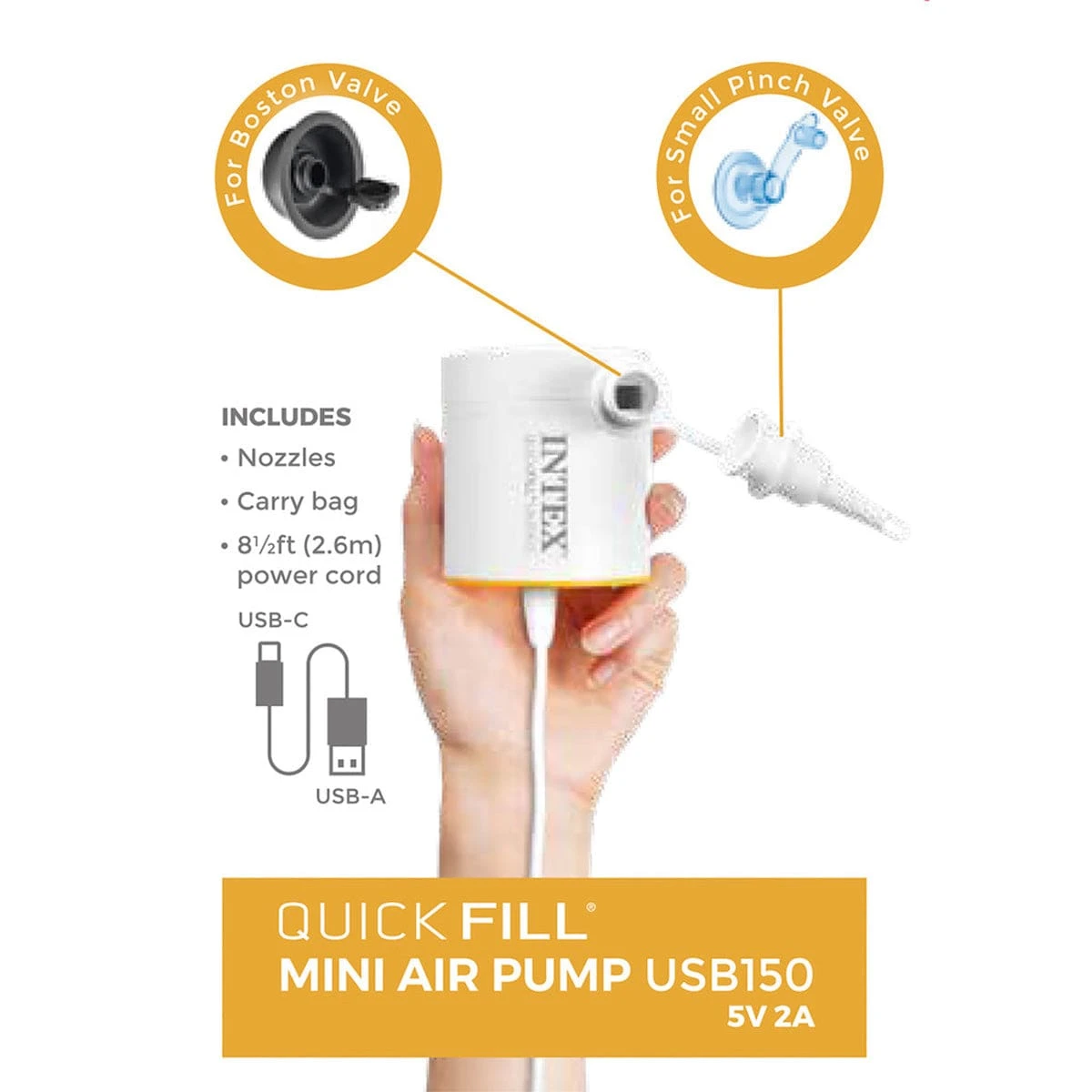The INTEX® QuickFill USB Mini Pump is a sleek, portable air pump easily powered by a variety of USB-compatible power sources, thanks to its included USB-A-to-USB-C power cord (USB-A cube not included). Stow or transport this mini pump in the convenient carry bag that comes with it. It’s perfect for inflating pool floats and camping mats on the go.