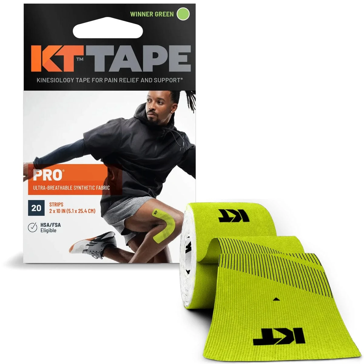 KT Tape Pro® is pre-cut and ready to apply right out of the box. Pre-cut strips have rounded corners which help to prevent the corners from catching on clothing or the edges fraying. Each roll contains 20 pre-cut strips that are 10 inches long and 2 inches wide.