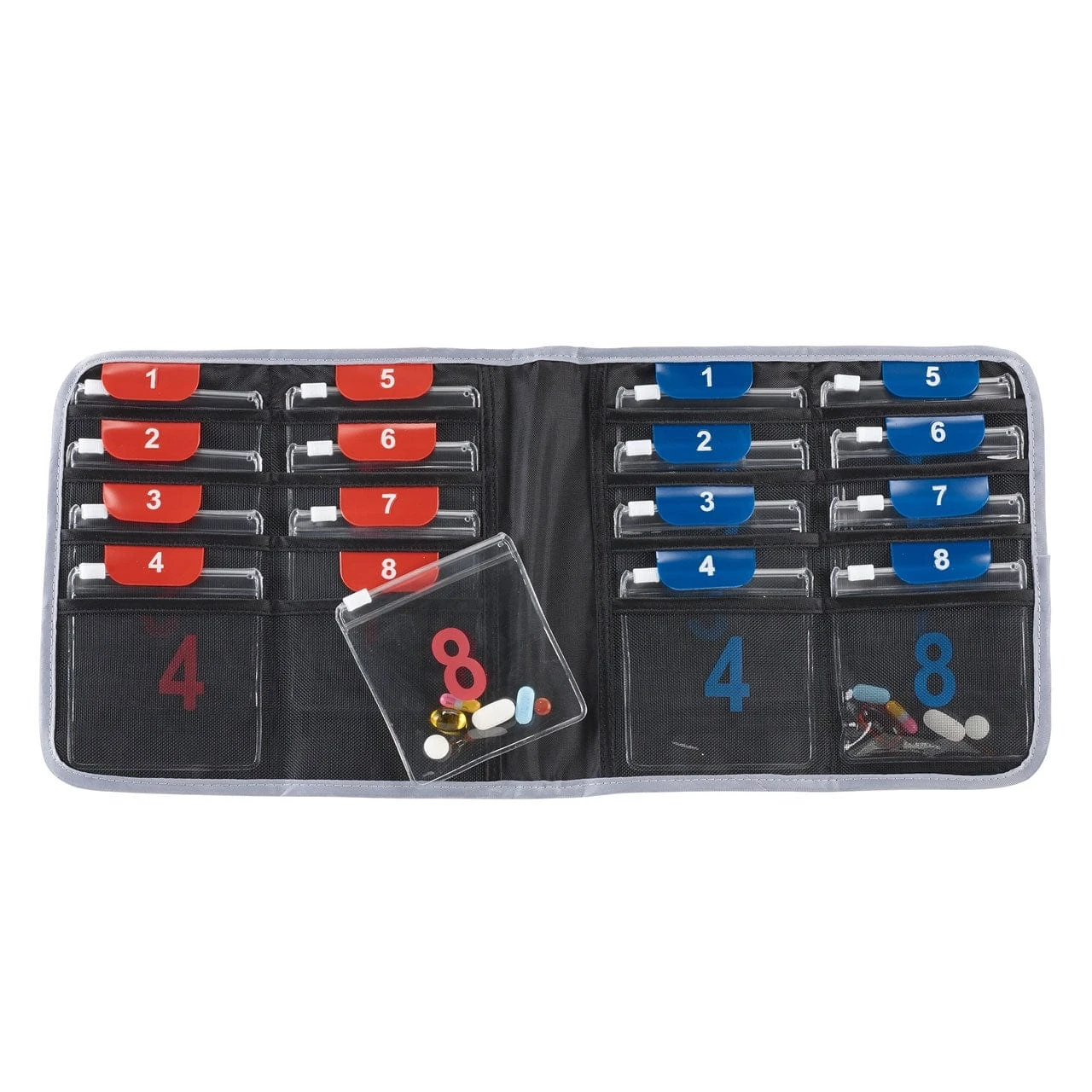 Featuring a discreet black exterior, this organizer opens to reveal sixteen clear, slide-locking pouches. Each pouch is color-coded with red and blue tabs and numbered to help you distinguish between daytime and nighttime doses. The adjustable Velcro closure ensures the kit stays compact whether it is empty or full.