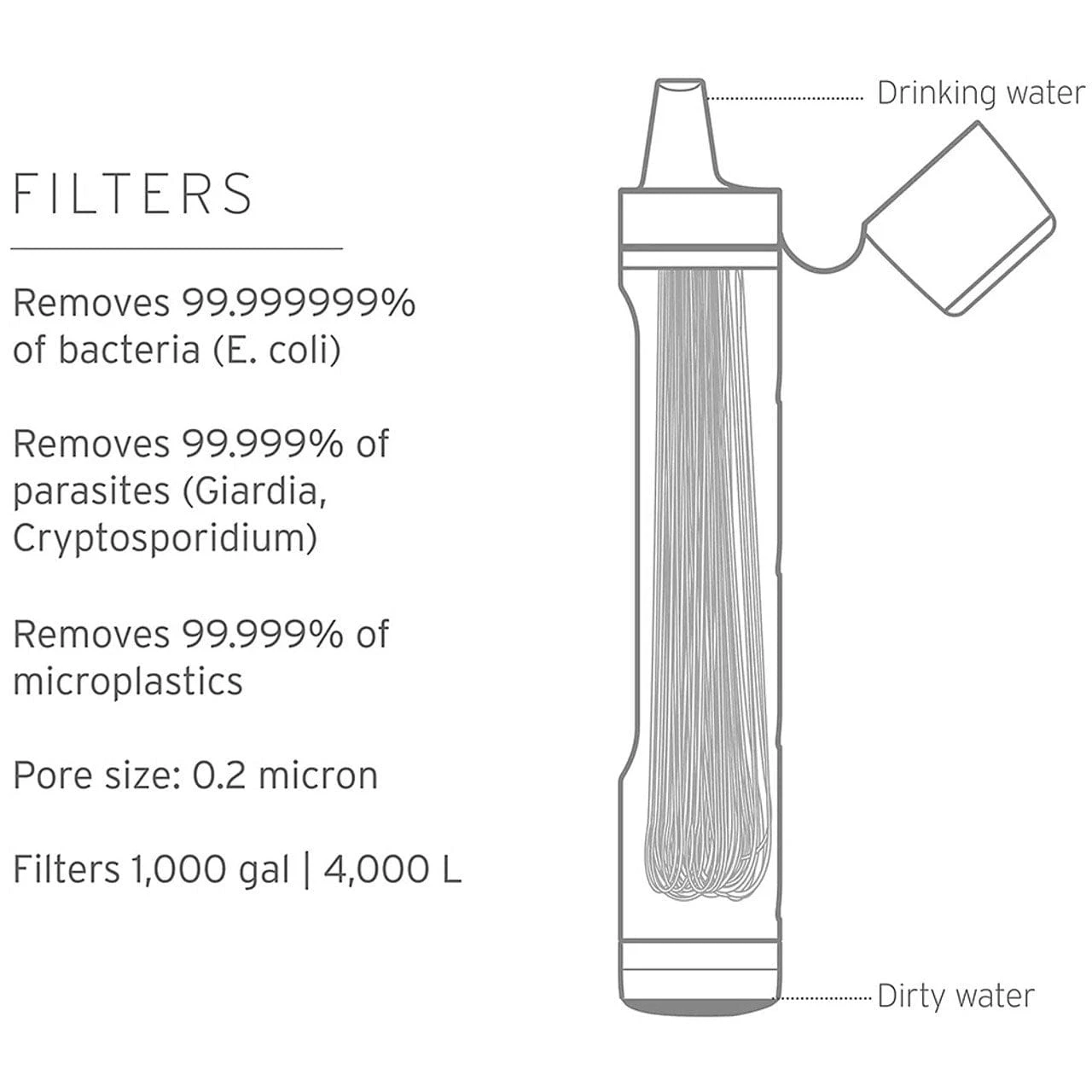- Long-Lasting: The membrane microfilter provides up to 1,000 gallons (4,000 L) of safe drinking water—enough for one person for over 5 years.