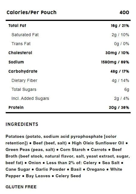 A blend of tender diced beef, carrots, peas, and potatoes are sure to give you that warm, fuzzy feeling of satisfaction. Ideal for warming up in the backcountry.