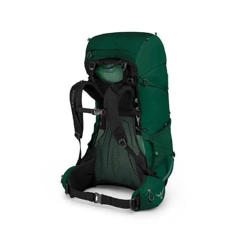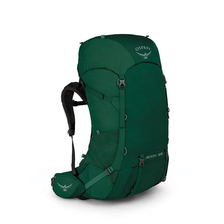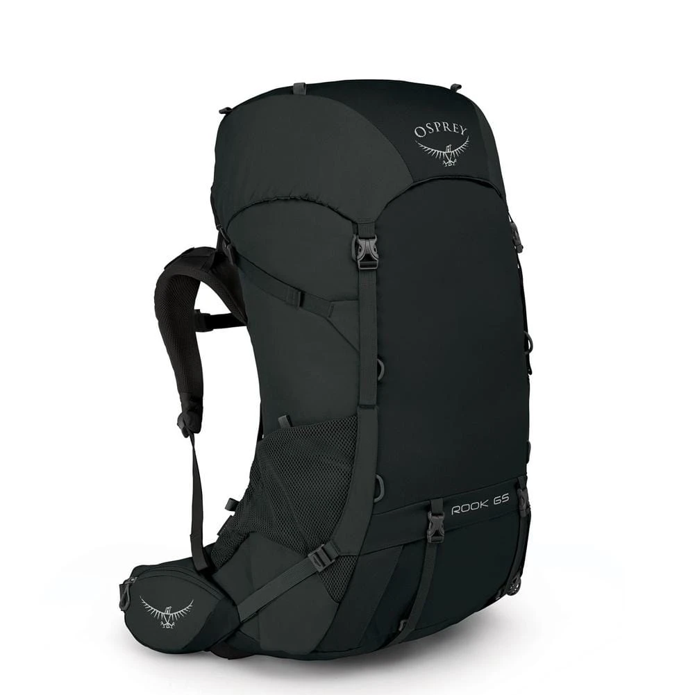The Rook 65 stands out with its prominent AirSpeed suspension system, utilizing a tensioned mesh back panel that creates a cooling gap between the wearer and the pack. The sleek internal frame is complemented by rugged fabrics and integrated features like the removable raincover stored at the base.