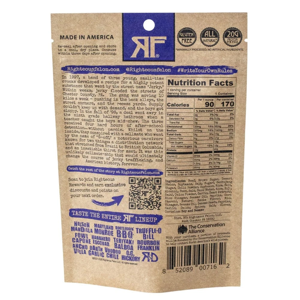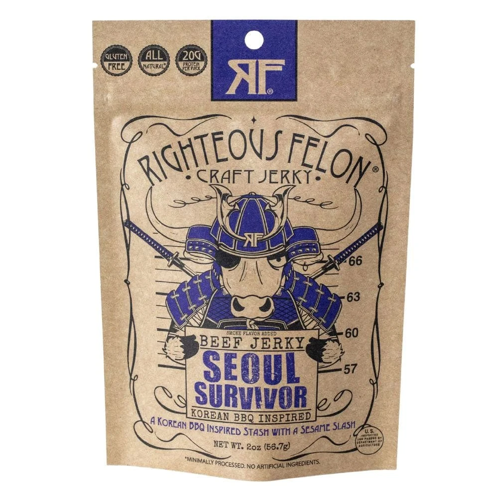 During 2021’s “March Meatness” Tournament, one contestant captivated the tastebuds of fervent Righteous Felon fans everywhere: Korean BBQ. Outlasting 15 adversaries to be crowned victorious in the Grande Felonale, we’ve christened our new Korean BBQ Jerky with a moniker to match. Hailing from the city of its namesake, a fighter, a myth, the sweet taste of self-preservation itself: Seoul Survivor. Get ready to K-pop a piece of this transpacific pocket-steak into your piehole and go Gangnam style.