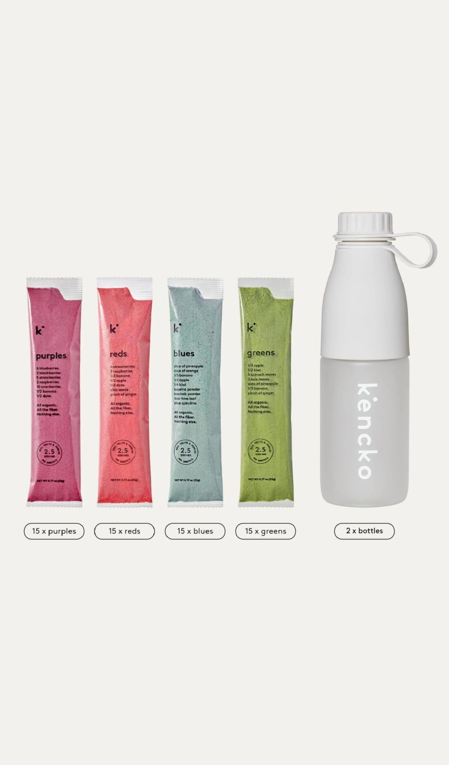 The smoothie lover’s smoothie pack – blues, greens, purples, and reds for days, each containing a full cup of organic fruits & veggies! Includes two reusable shaker bottles to prepare all those smoothies in.