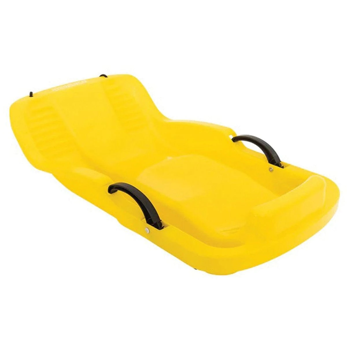 Don’t let the simple design of this Sportsstuff snow sled with brakes fool you! It has a classic toboggan-style design, but it packs a punch when it comes to extra modern features. First, there’s the extremely durable plastic construction, which wont break or snap like ordinary sleds. It also has two molded handles with brake access, so you can slow down or stop whenever you need to. Lastly, the high-quality rope helps you transport your heavy-duty plastic snow sled with ease. Color: yellow.