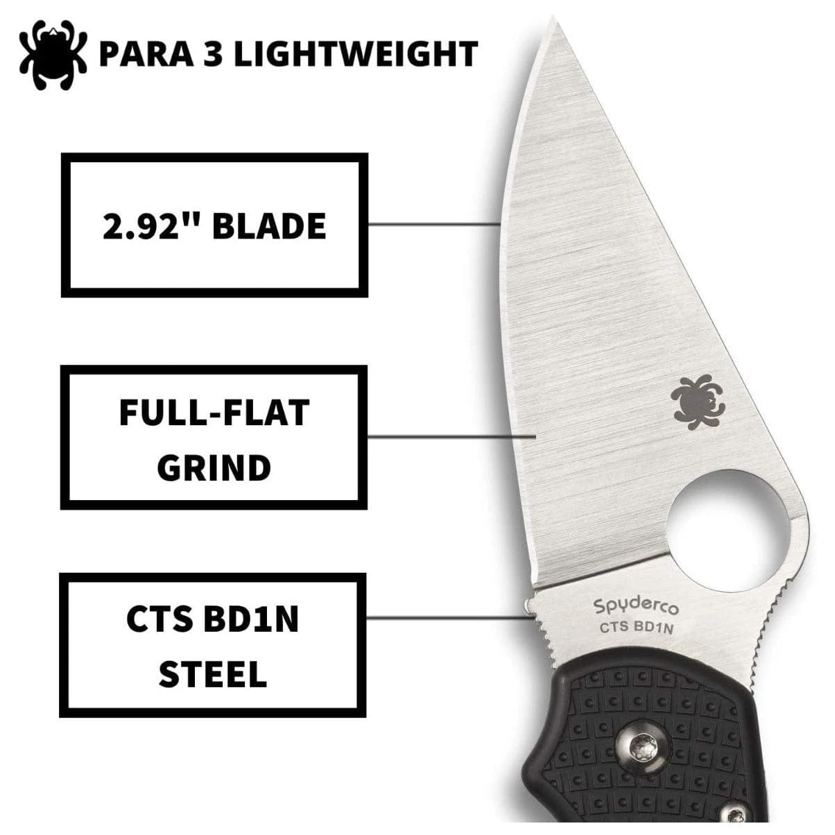 Almost 30 percent lighter than its G-10-handled counterparts, the Para 3 Lightweight boasts linerless, open-backed construction and Spyderco’s high-traction Bi-Directional Texture™ pattern for a secure grip. A stainless steel lock bar inset into the handle’s interior forms the foundation of its sturdy lock mechanism, while keeping the overall weight to an absolute minimum. The knife’s full-flat-ground blade is crafted from CTS® BD1N, a nitrogen-enriched high-carbon chromium steel that offers a superior balance of hardness, edge retention, and corrosion resistance.