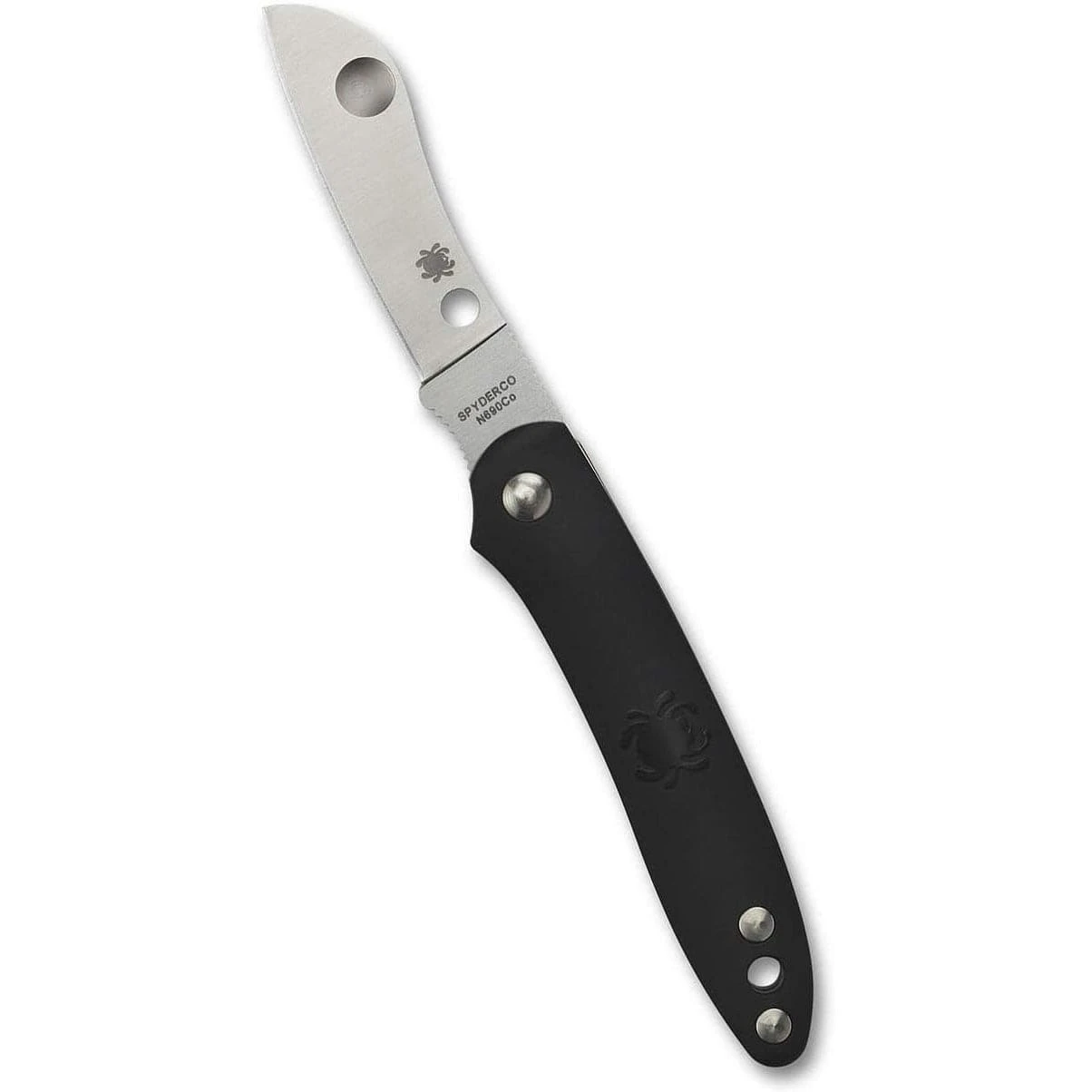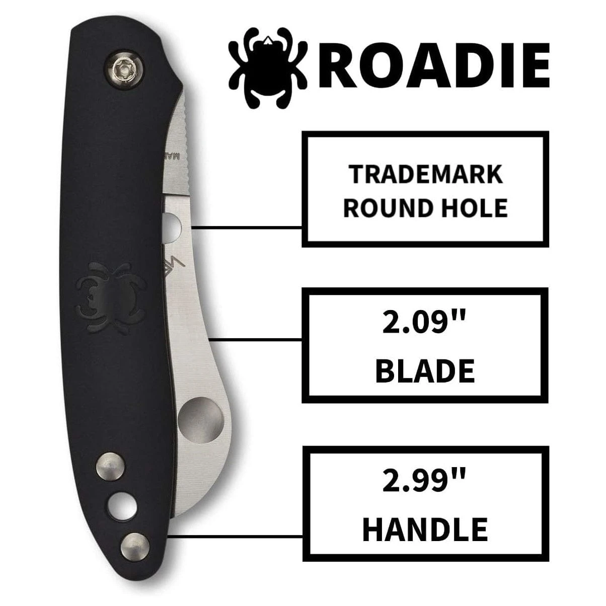 Unlike a traditional slipjoint, the Roadie’s blade is held open by an improved notched-joint mechanism. Its spring also forms the handle’s full-length back strap, giving it structural strength and providing a foundation for the durable fiberglass-reinforced-nylon (FRN) scales. The injection-molded scales are contoured for comfort and feature a recessed Spyderco “bug” logo on both sides. They are also available in a wide variety of colors to suit every taste.