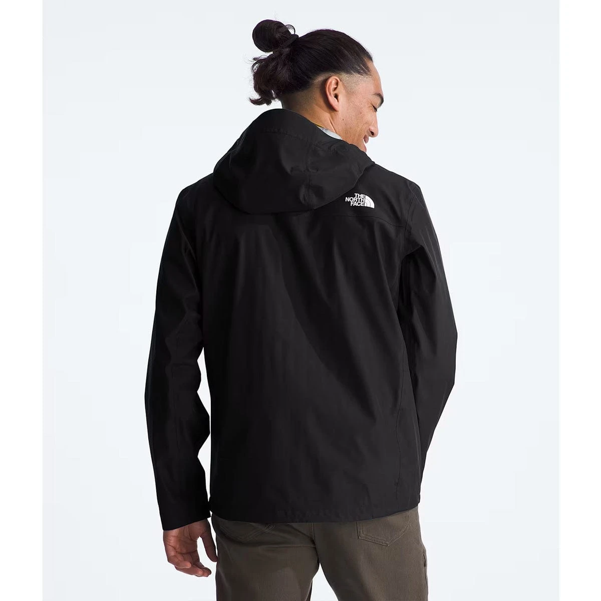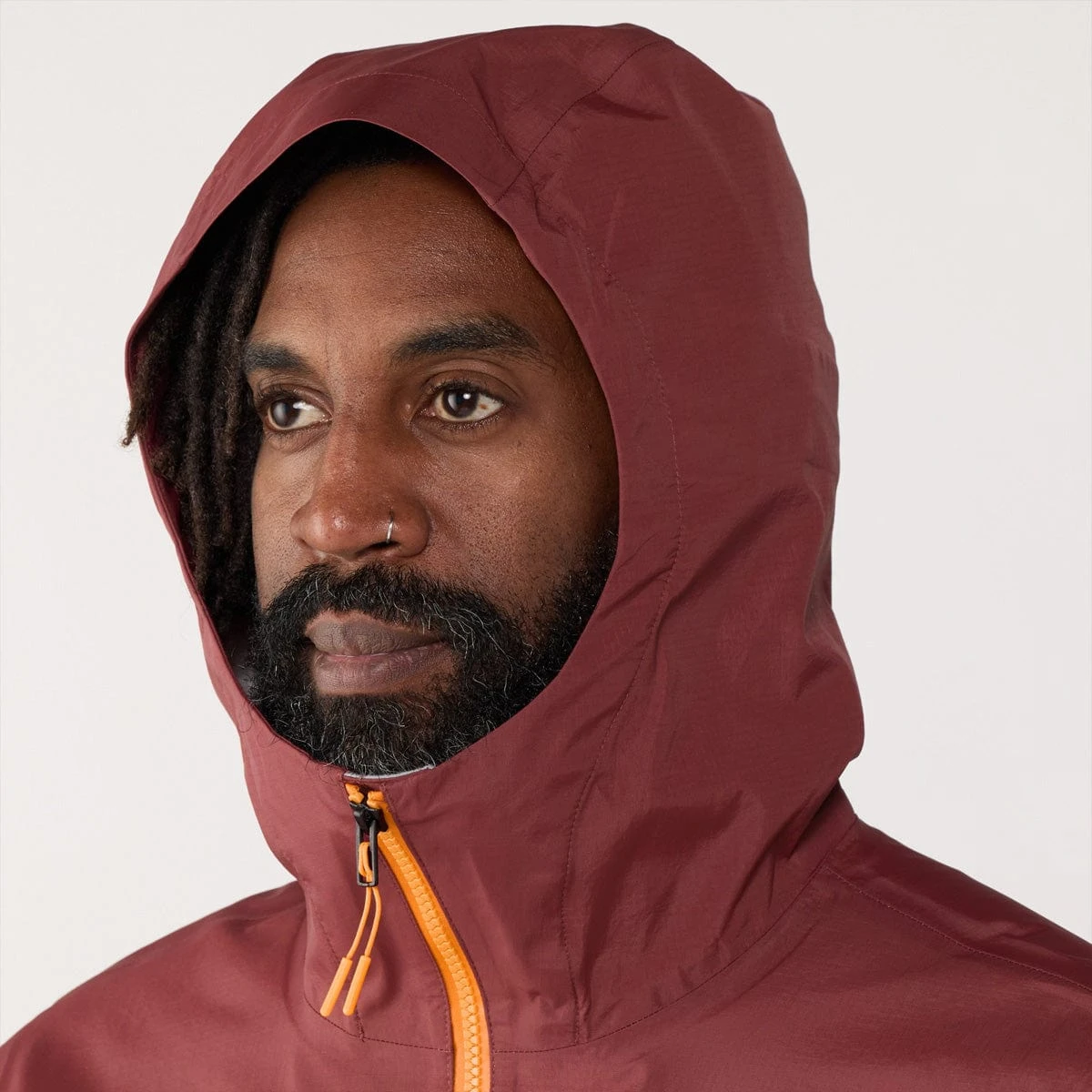 - Attached, adjustable, three-piece hood with a bonded brim and a cinch-cord with a cord lock in back
